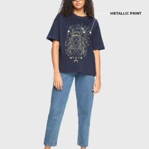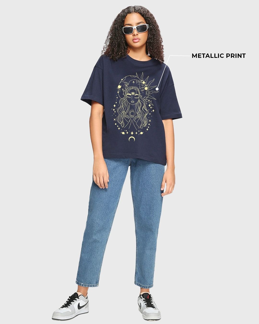 Step into your power with the Women’s Blue Oversized “Stardust Soul” Graphic T-Shirt. This enchanting tee blends astrology, femininity, and cosmic elements in a stunning gold print. With a serene celestial goddess, stars, moons, and planets surrounding her, it’s a tribute to the universe within you. Made in a soothing navy blue shade and crafted for comfort, it’s perfect for free spirits, dreamers, and stargazers.
